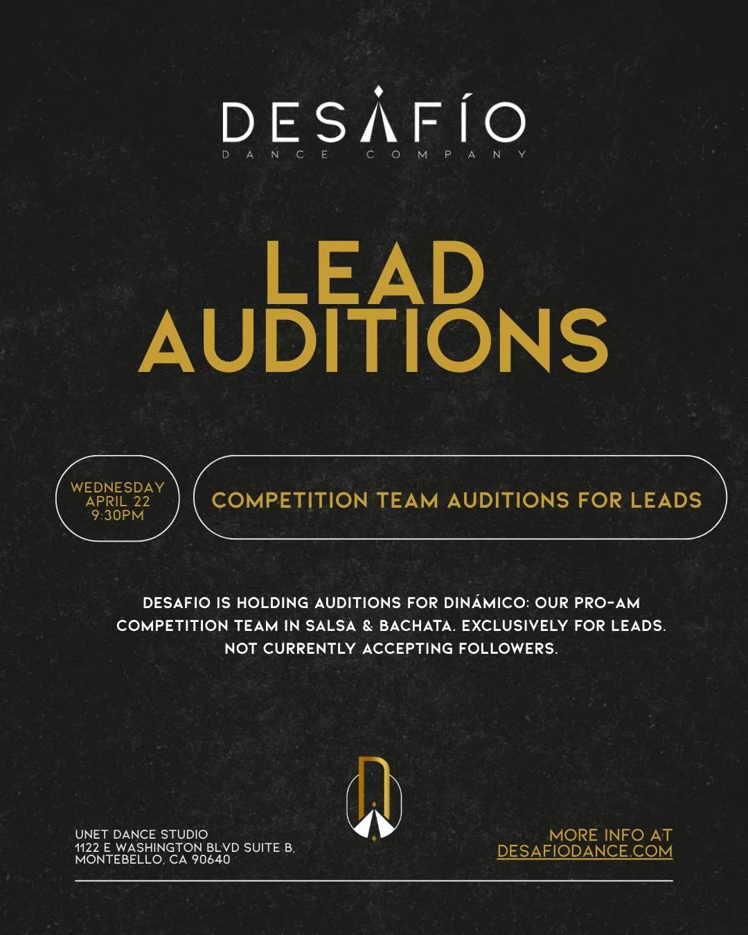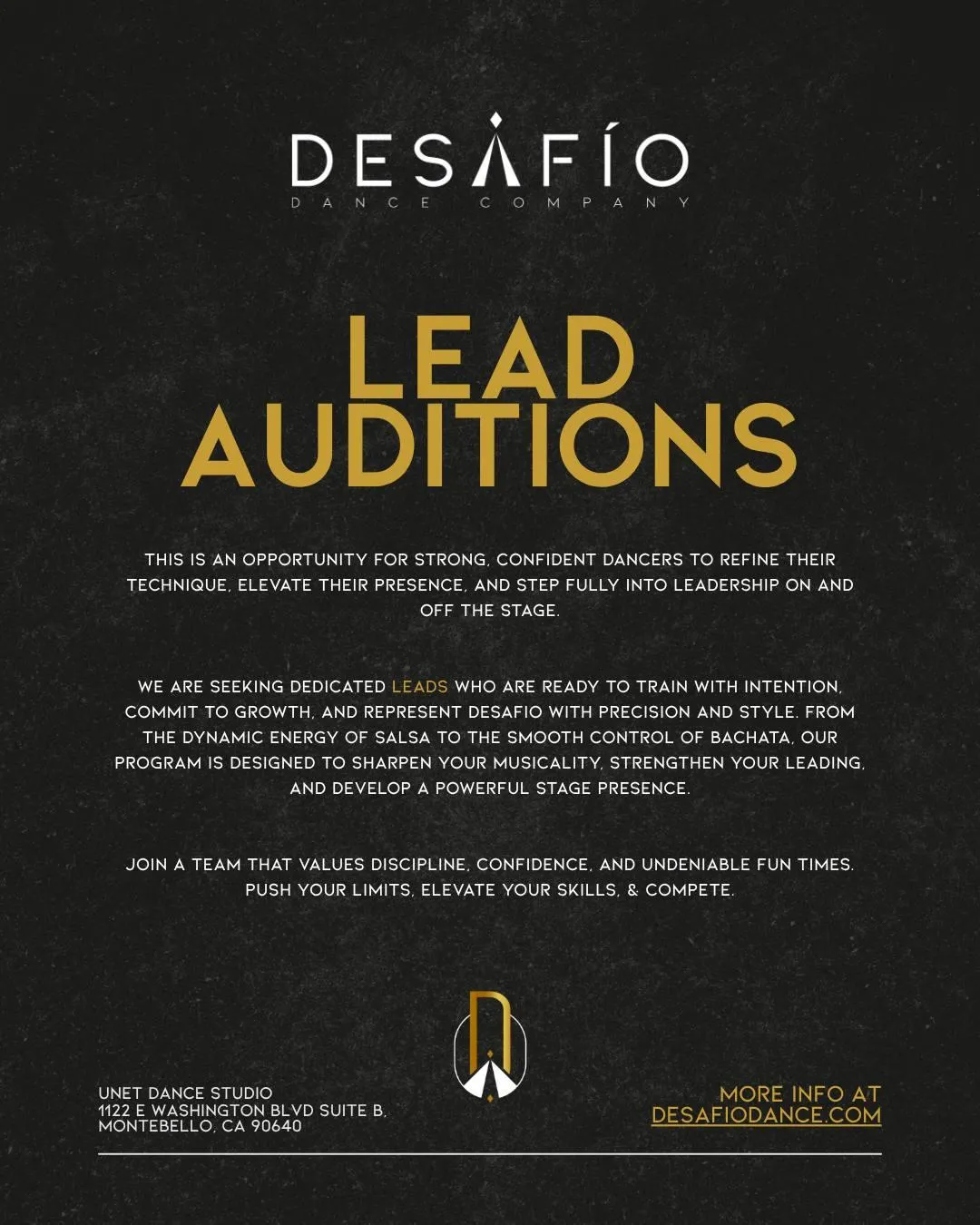 Step into leadership and take your dancing to the next level. Join Desafío Dance Company’s exclusive Lead Auditions and showcase your confidence, technique, and stage presence. Audition for Desafío’s competition team and elevate your salsa and bachata to a whole new level.